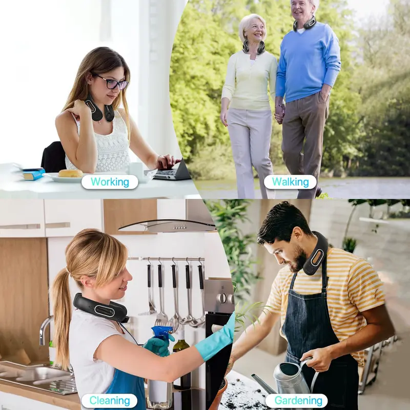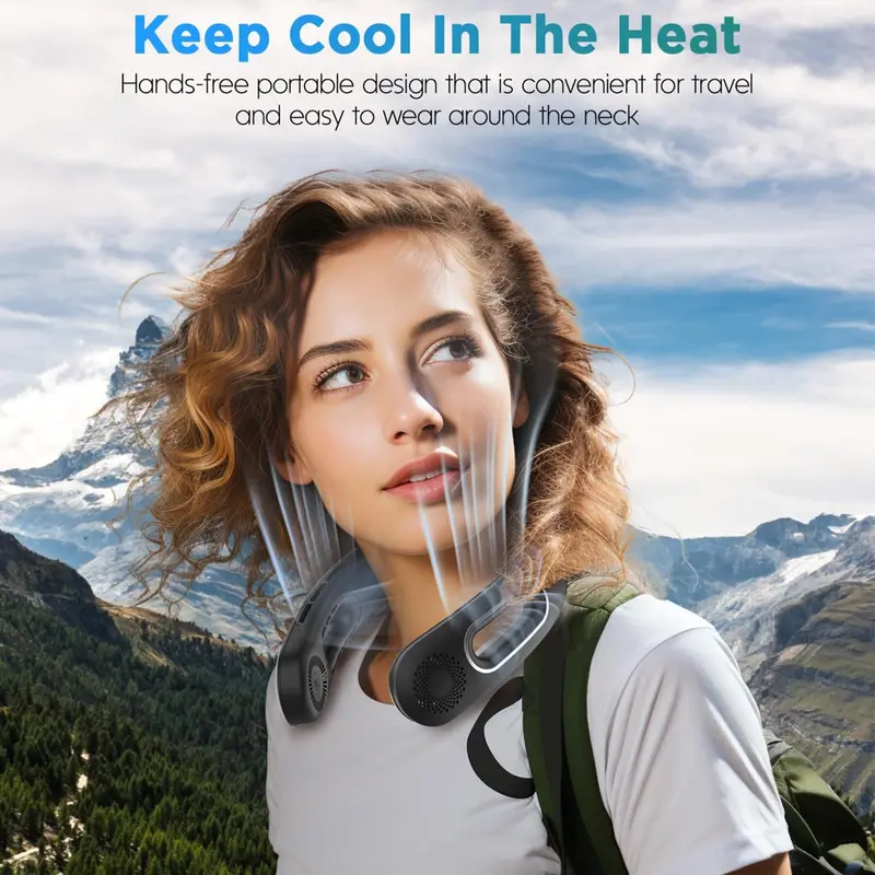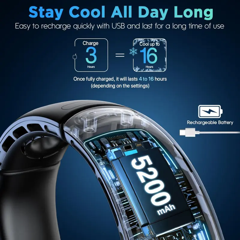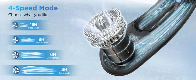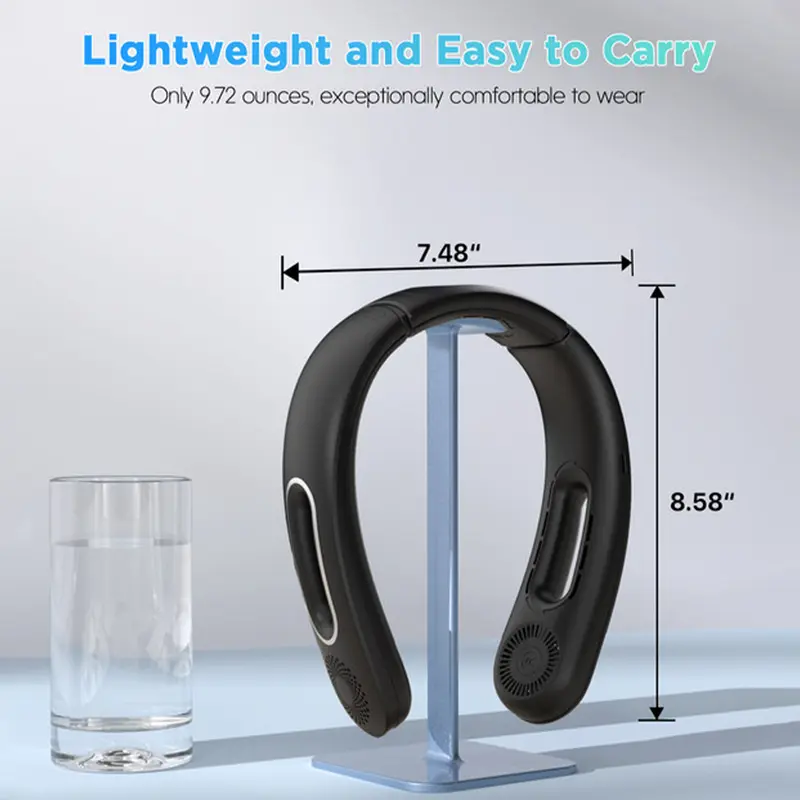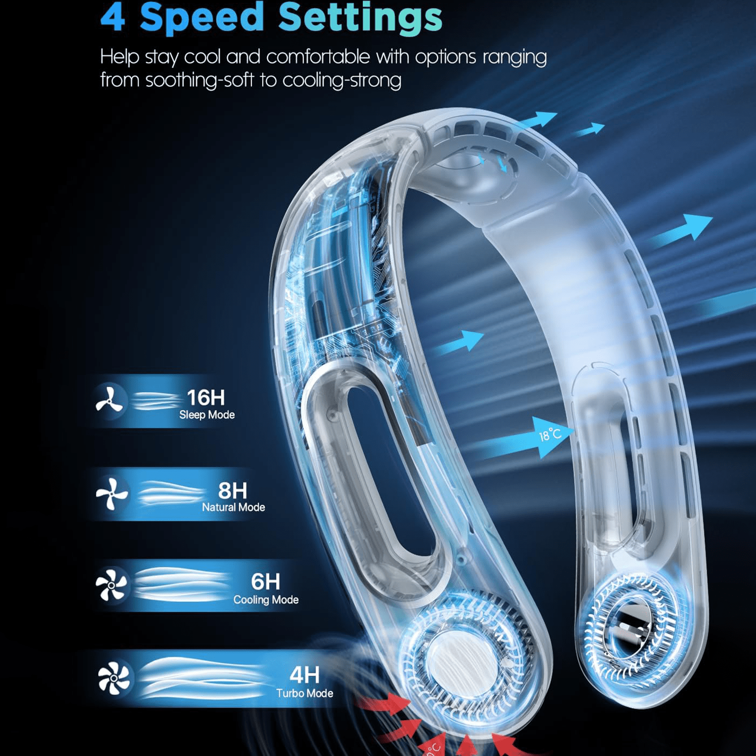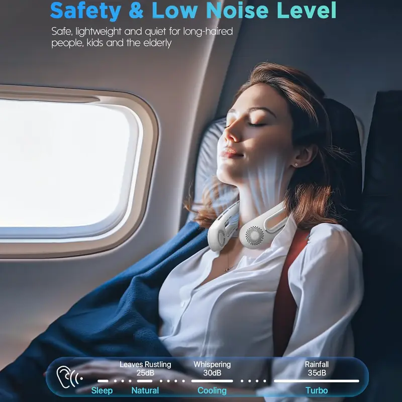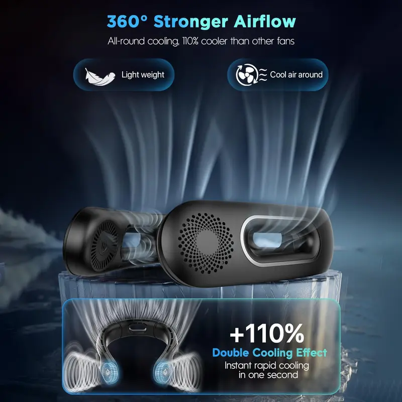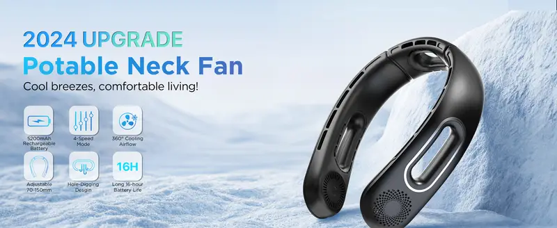 About this item: 【Upgraded & Enhanced Cooling Design】Our neck fan is a novel portable fan and wearable fan that blows cool air by generating 360° surrounding airflow with its unique hole-digging design and dual-layer air outlet technology. This makes the personal fan remarkably lightweight and reduces the contact surface with the skin, improving heat dissipation by 80%. It is designed to keep you cool around the neck and face, which makes a difference when you’re outside in this heat. 【4-16 Running Hours & 4 Speed Settings】Presenting 4 modes (Sleep/Comfortable/Cooling/Turbo) and 4 speeds from soothing-soft to cooling-strong, you can easily adjust the airflow speed for your comfort by simply pressing the power button. With a built-in 5200mAh rechargeable battery, the neck fans portable rechargeable run for up to 16 hours continuously in sleep mode (at 40% volume) or 4 hours in turbo mode. A single charge lasts a long time and keeps you cool all day. 【Designed for Comfort & Safety】The bladeless neck fan air conditioner weighs only 9 oz and features a 3 large hole design on the device to put less strain on the neck, delivering unmatched comfort and a cool breeze. Made of skin-friendly ABS material, the hair pinch-proof design adds extra comfort and ensures the user’s safety for long-haired people, kids, and the elderly. The cooling neck fan is designed to provide hands-free operation, keeping you cool while engaging in various activities. 【Sleek & Trendy Design, Stylish & Practical】The portable fan for travel boasts 360-degree surrounding airflow for cooling, a stylish appearance, and a hands-free portable design that is convenient for trips and easy to wear around the neck. Personal fans for your neck offer practicality for staying cool during various outdoor activities such as gardening, traveling, hiking, biking, and concerts. They are also great for staying cool at work, exercising, cooking, and working in hot environments.